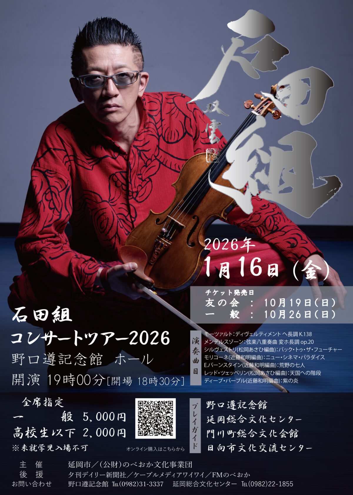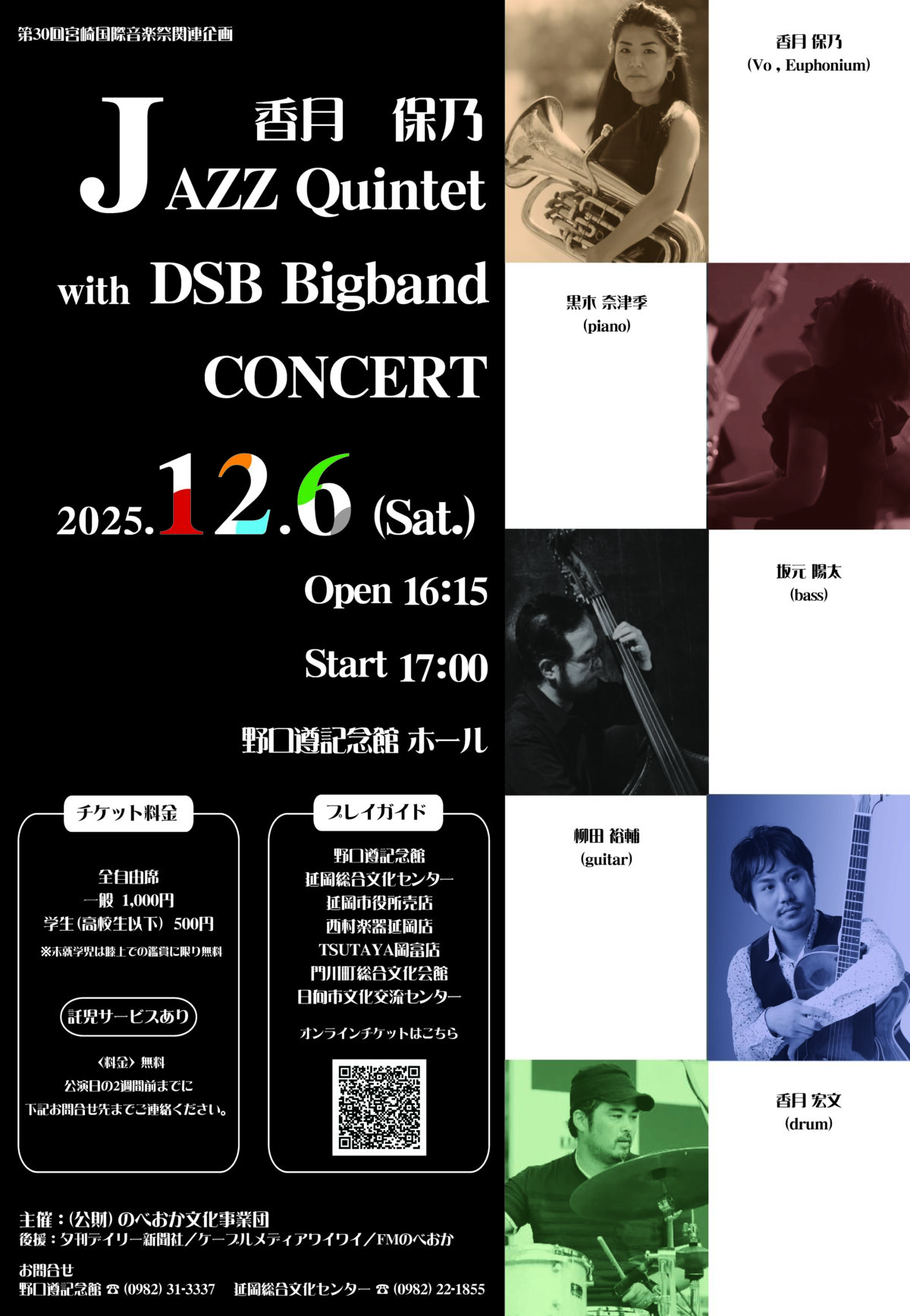 本日のイベント 10月13日( 月 ) ホール 本日のイベントはありません フリースペースA 本日のイベントはありません フリースペースB 本日のイベントはありません ギャラリー 野口遵顕彰ギャラリー ピックアップイベントPICK UP 2025年10月2日(木)~2026年1月31日(土) ※水曜・年末年始を除く 9:00~18:30(参加受付の時間になります。受付後はいつでも自由に参加できます。) のべおか謎解きウォーク ~Nからのメッセージ~ 2025年12月6日(土) 開場16:15 開演17:00 第30回宮崎国際音楽祭関連企画 香月保乃 Jazz Quintet with DSB Bigband CONCERT チケット発売中! 2025年12月13日(土) 開場17:00 開演17:30 第38回のべおか「第九」演奏会「第九とクリスマスの夕べ vol.2」 チケット発売中! 2026年1月16日(金) 開場18:30 開演19:00 石田組コンサート2026(8人編成) 先行発売10/19(日)/ 一般発売10/26(日) イベント情報 お知らせINFORMATION 2025.10.01 施設予約の受付開始時期について(野口遵記念館) 2024.11.29 公演チケットのオンライン購入について 2024.08.09 聴覚障がい者補聴誘導システム受信機貸出しのご案内 2024.07.01 申請書様式について