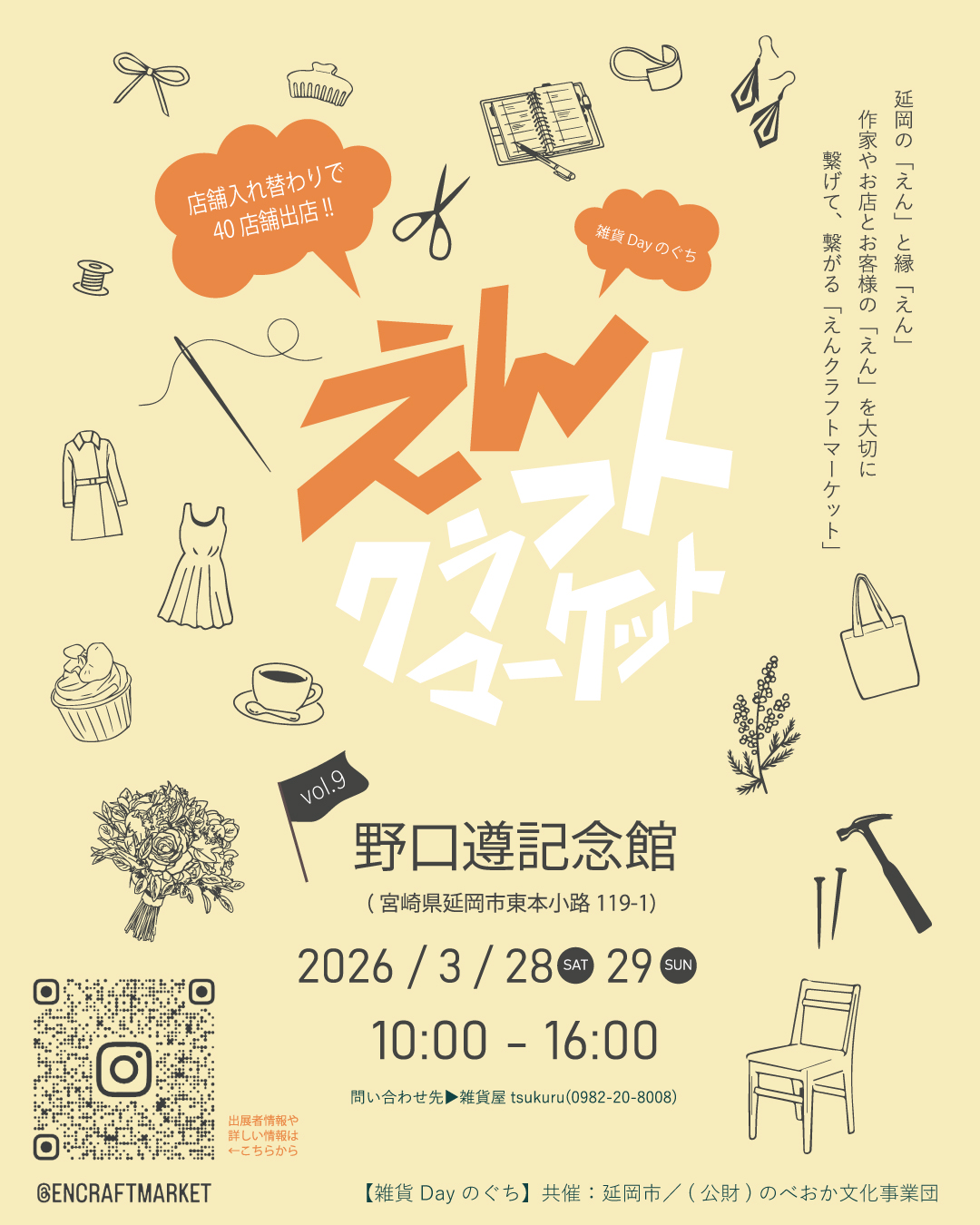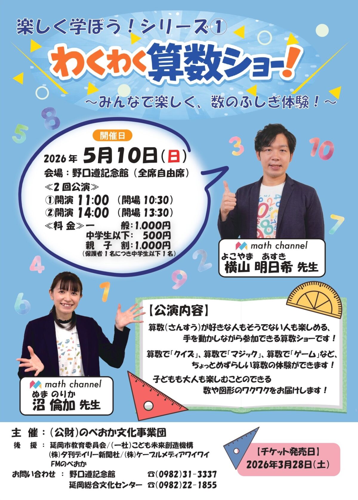 本日のイベント 3月24日( 火 ) ホール 本日のイベントはありません フリースペースA 本日のイベントはありません フリースペースB 本日のイベントはありません ギャラリー 野口遵顕彰ギャラリー ピックアップイベントPICK UP 2026年3月28日(土) 10:00~11:00(最終受付10:30) 楽しく学ぼう!わくわく科学遊びワークショップ「作って実験!キラキラ☆キーホルダー」 申込受付中! 2026年3月28日(土) 開場11:10 開演11:30 楽しく学ぼう!わくわく科学遊び チケット発売中! 2025年3月28日(土)・29日(日) 10:00~16:00 雑貨Dayのぐち「えんクラフトマーケットvol.9」 2026年5月10日(日) 2回公演 ①11:00 ②14:00 楽しく学ぼう!わくわく算数ショー イベント情報 お知らせINFORMATION 2026.03.01 施設予約の受付開始時期について(野口遵記念館) 2025.11.10 延岡総合文化センター開館40周年記念 「文化祈念シンポジウム」の開催について 2024.11.29 公演チケットのオンライン購入について 2024.08.09 聴覚障がい者補聴誘導システム受信機貸出しのご案内 お知らせ一覧