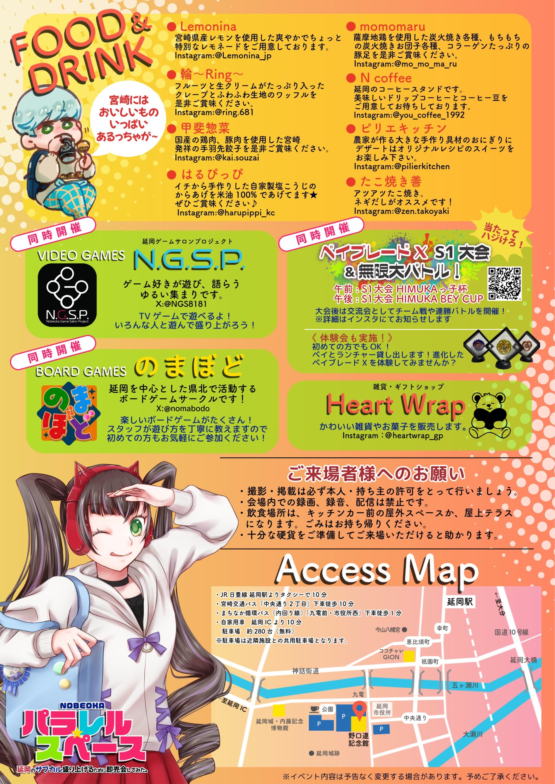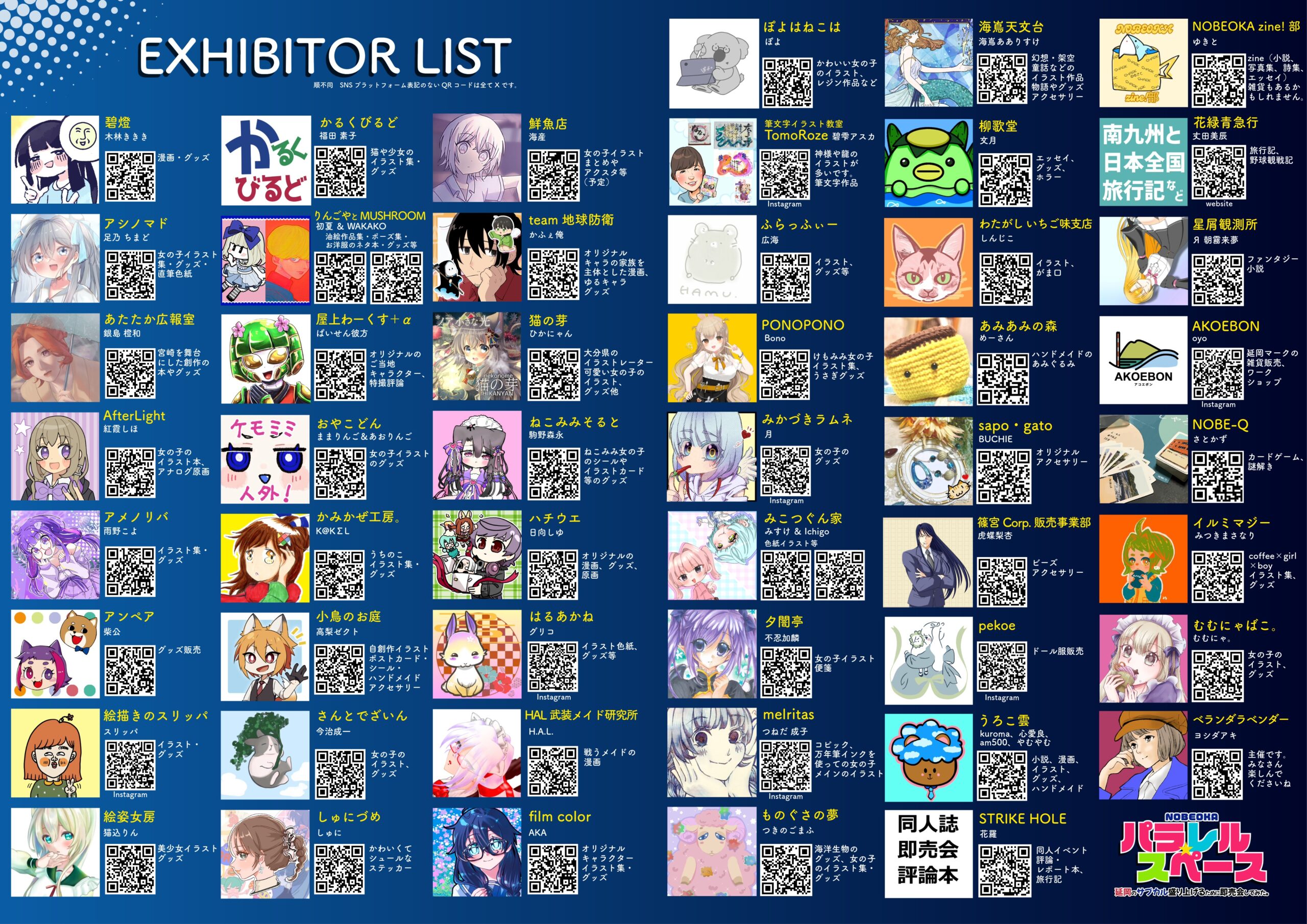 イベント情報 EVENT にぎわい創出チャレンジ企画「延岡パラレル☆スペース~延岡のサブカル盛り上げるために即売会してみた。~」 開催日:2026年1月24日(土) 時間:11:00 ~ 16:00 料金:入場無料 会場:野口遵記念館 交流ラウンジ他 チラシ裏面 出展者一覧 お問い合わせ:野口遵記念館 ℡(0982)31-3337 最終更新日: 2026.01.04 / 投稿日: 2025.12.05 カテゴリー: 1月のイベント イベント情報一覧